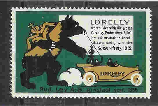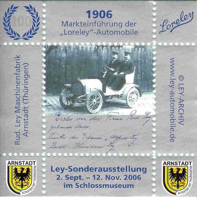 Der Block zur Markteinführung der „Loreley“-Automobile vor 100 Jahren zeigt das erste von der Firma Ley gebaute Auto mit Alfred Ley am Steuer. Darunter ist sein entsprechender Originalvermerk von der Fotorückseite wiedergegeben.